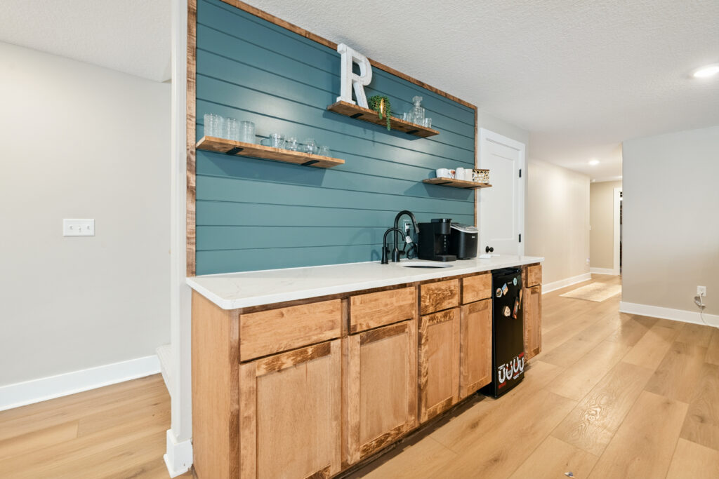 Tile to the ceiling completes the look for this large kitchen area. Floating shelves and a large window amplify the kitchen’s open-concept design.